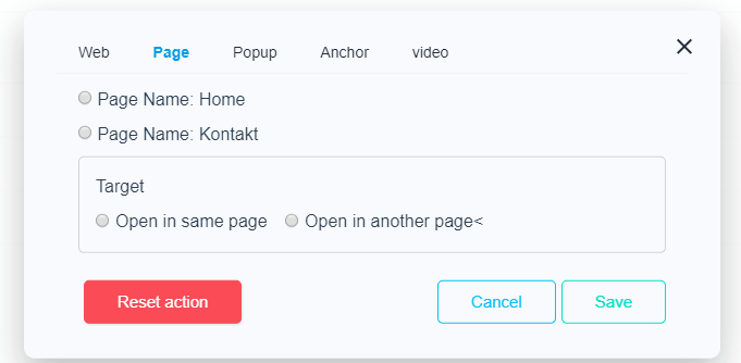 Mit dem jeweils ersten Symbol können wir die Links festlegen – ob du auf externe Webseiten verlinken willst oder auf interne Seiten (Page) – oder auch auf Anker (Anchor) – und auch, ob die Seite im gleichen Fenster oder einem neuen geöffnet werden soll: