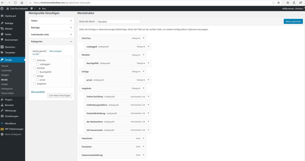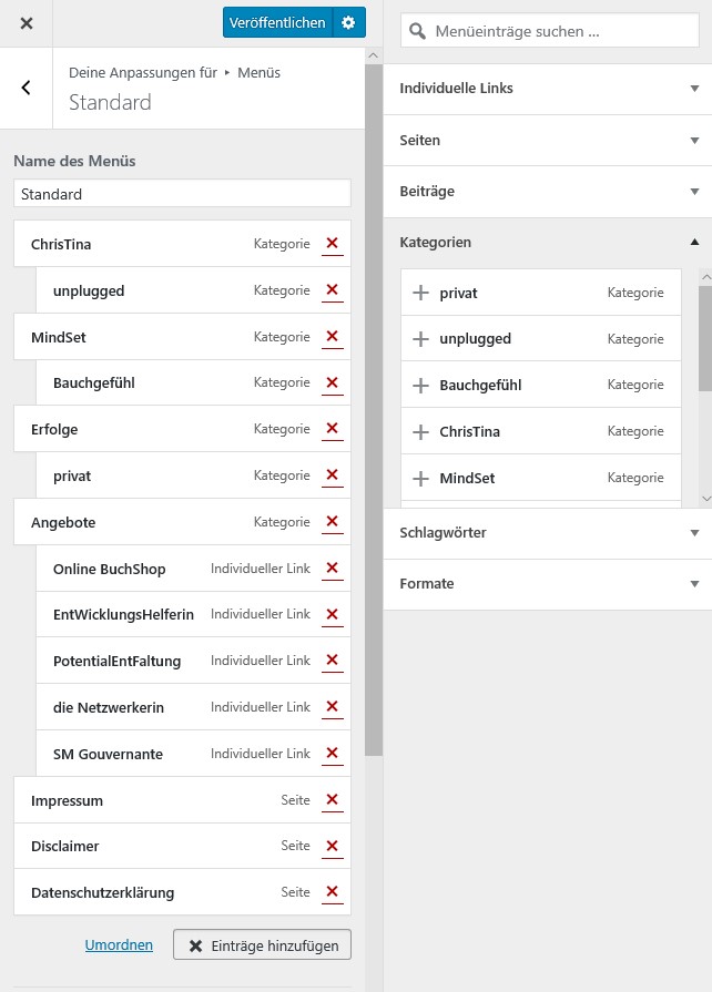 Und man kann mehrere mit einander kombinieren, wie in meinem Fall – also ich habe eigene Seiten gewählt für Impressum & Co – dann eben Kategorien – und letztendlich externe Seiten für meine Angebote.
