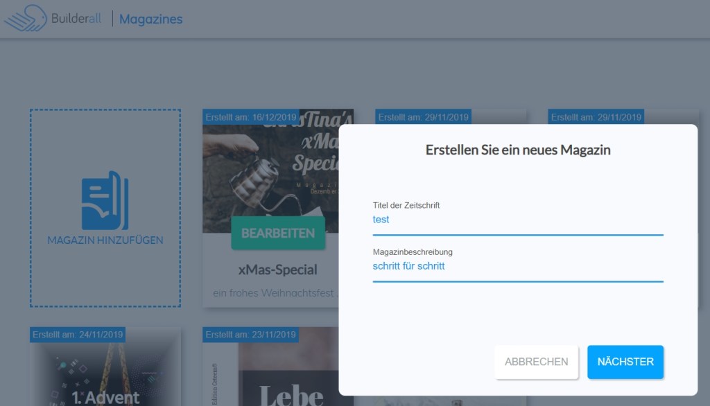 Also zuerst die Magazin-App öffnen und dann ein neues Magazin anlegen: