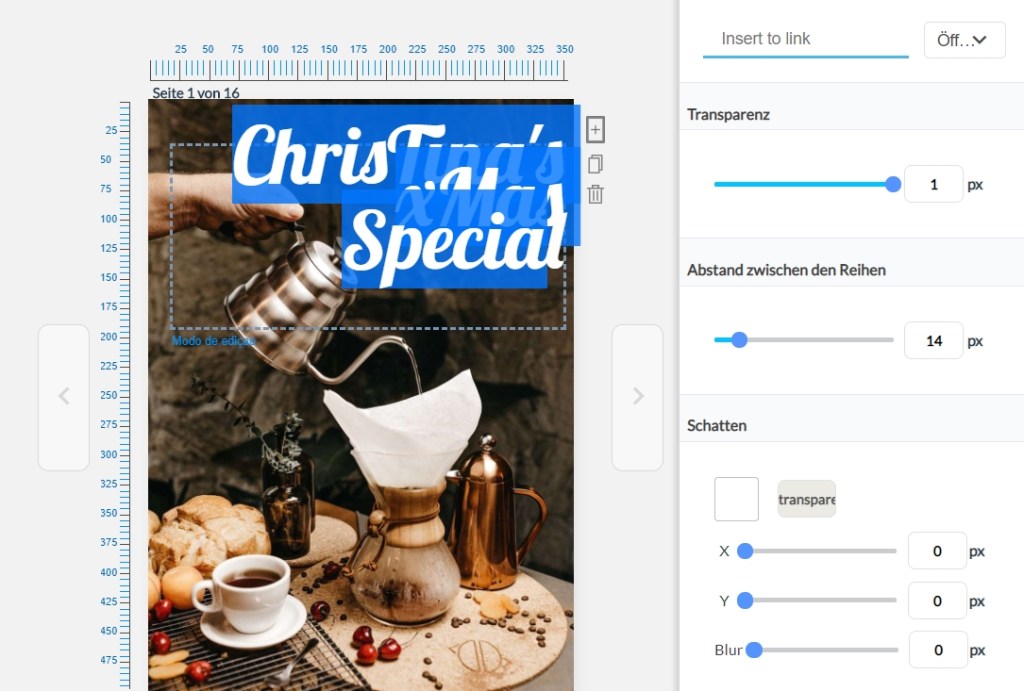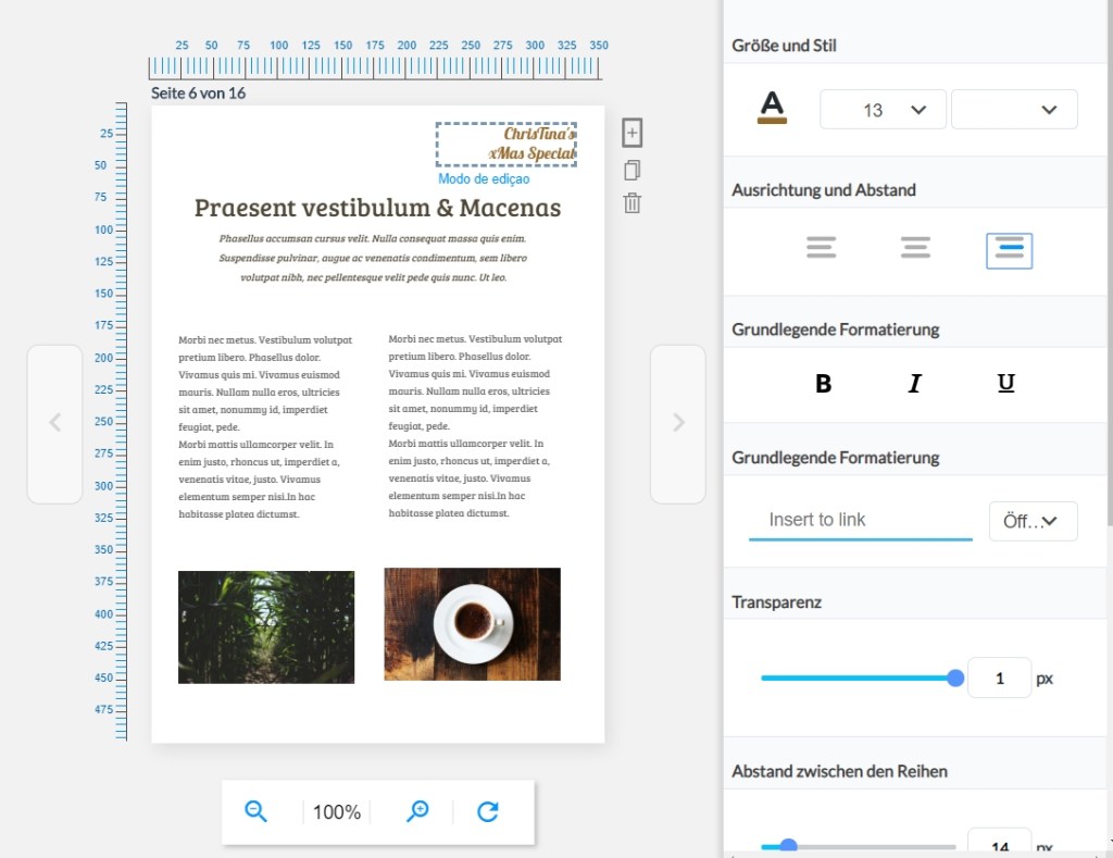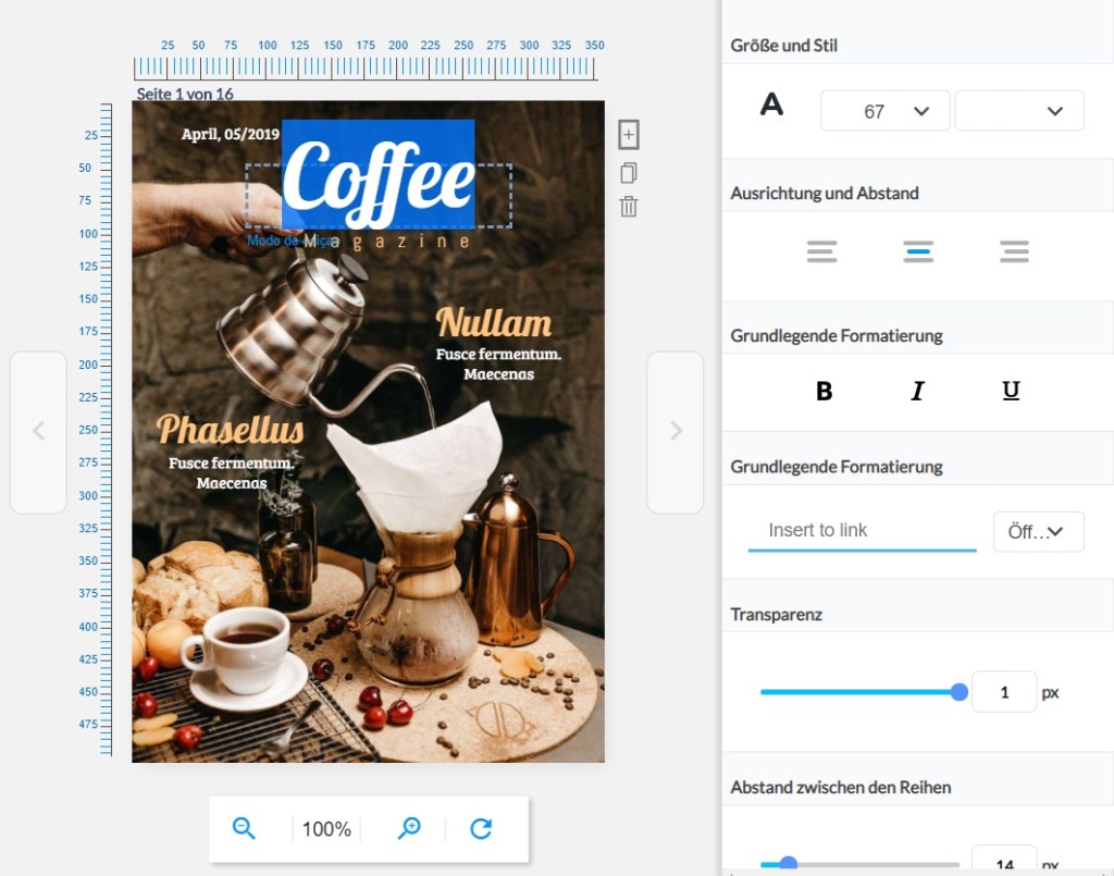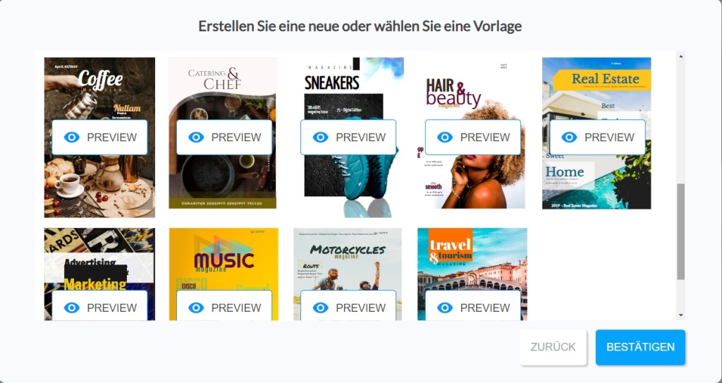 Hier muss unbedingt ein Titel und eine Beschreibung eingetragen werdenIm nächsten Schritt wird eine Vorlage ausgewählt – mit Preview kannst du dir in einem neuen Tab die Vorschau anschauen – danach Vorlage 1x anklicken = markieren – und mit – Bestätigen – weiter gehenEs wird das neue Magazin in der Übersicht angezeigt – mit – Bearbeiten – kann es dann – auch später – bearbeitet werdenIn einem vorhandenen Text doppelklicken, dann öffnet sich rechts eine Liste der Bearbeitungsmöglichkeitensobald du außerhalb des Textfeldes hinklickst, kommen 8 Markierungspunkte, mit denen du das Feld vergrößern kannst.Eventuell musst du auch noch den Abstand zwischen der Reihen vergrößern, damit mehrzeilige Schriften auch zu lesen sind 😉im nächsten Schritt will ich das „Logo“ links oben verändernNicht benötigte Textfelder mit der ENTF-Taste löschen – dann auf Bestätigen, egal, in welcher Sprache die Meldung kommt 😉den gewünschten Text eingeben und eine Schriftfarbe auswählen – gleich dazu gesagt – wenn du später noch irgendwelche Überschriften mit der Farbe haben möchtest, kopier dir diesen HEX-Code, dann bekommst du einheitliche Textfarben – du kannst auch die Farben dort ändern, wo bereits eine andere Farbe festgelegt war und ist.