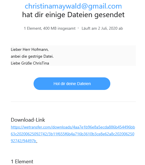 Wenn du mit WeTRansfer eine Datei bekommst – im entsprechenden eMail einfach den blauen Button anklicken – oder den Download Link – dann bekommst du folgendes Bild: