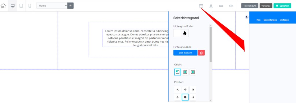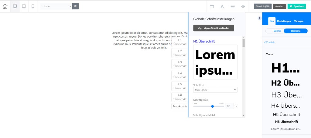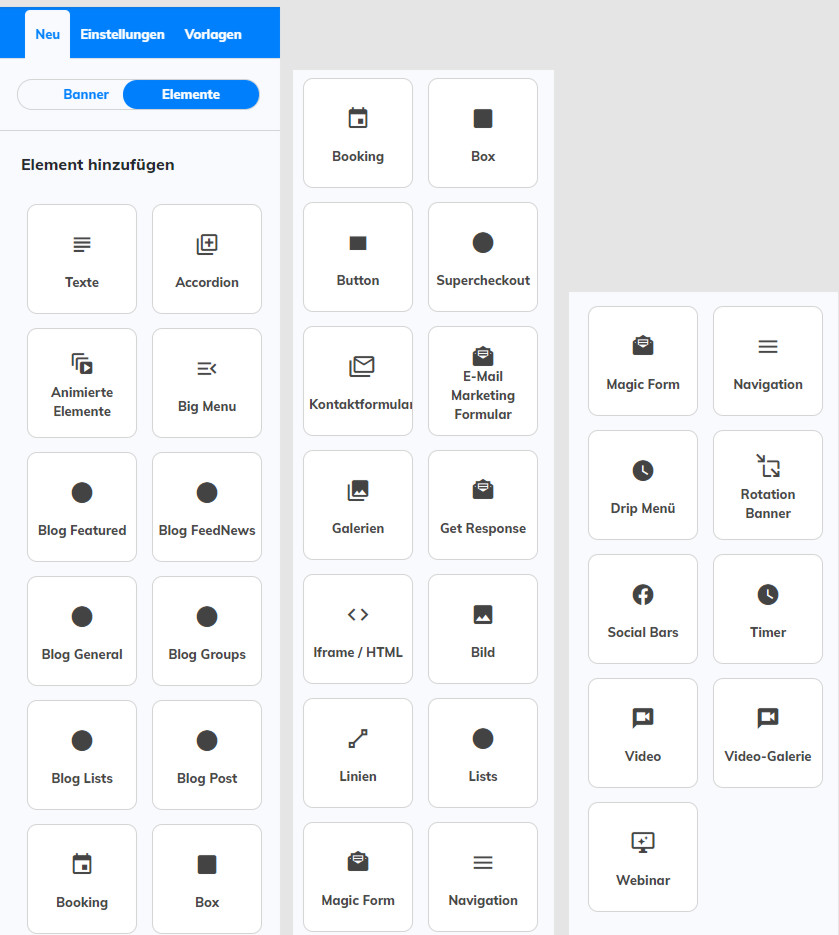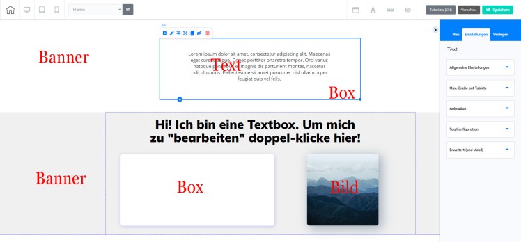 Der nächste wichtige Punkt – wenn du irgend etwas Neues in die Seite einfügen möchtest, beginnst du entweder mit – NEU – oder Vorlagen. Um zu Einstellungen zu gelangen, musst du einen Banner oder ein Element anklicken, dann erhältst du die Bearbeitungsmöglichkeiten – nachstehend nur ein Überblick – die jeweiligen Erklärungen folgen dann bei der Beschreibung der einzelnen Elemente: