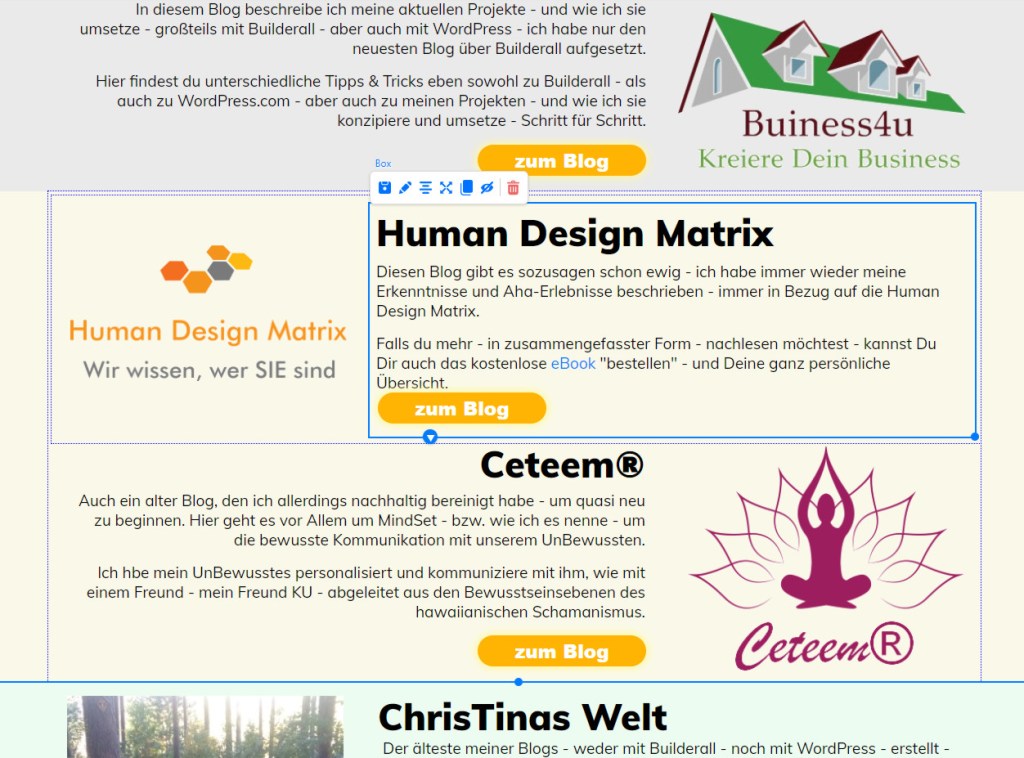 Und ich hab die erste Box so gemacht, wie sie mir gefällt – habe sie mir dann mobil angeschaut, ob alle Elemente in der richtigen Reihenfolge untereinander stehen – und habe dann die komplette Box mit den Inhalten kopiert – und dort dann jeweils die Texte und Bilder geändert.