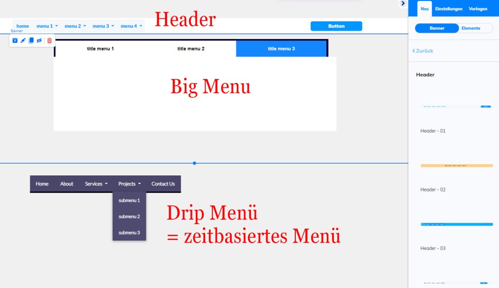 aber ein ganz normales Menü finden wir in den Elementen nicht. Das hat den Grund, weil cie normalen Menüs bereits im Banner – Header – mit drinnen ist – bzw. eben dort dann ausgewählt werden kann, welche Art von Menü man haben möchte.