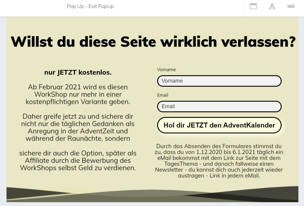 Nachstehend zwei meiner PopUps – das erste startete, sobald jemand begann, runter zu scrollen – und das zweite, wenn die Seite verlassen wurde: