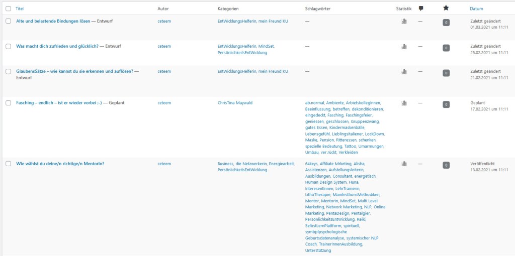 Du siehst immer bereits veröffentlichte Beiträge – dann eben geplante – und welche, wo Entwurf dabei steht. Die geplanten sind schon fix und fertig – und bei den Entwürfen fehlt noch irgend etwas – sobald sie fertig sind, plane ich sie auch fix vor.