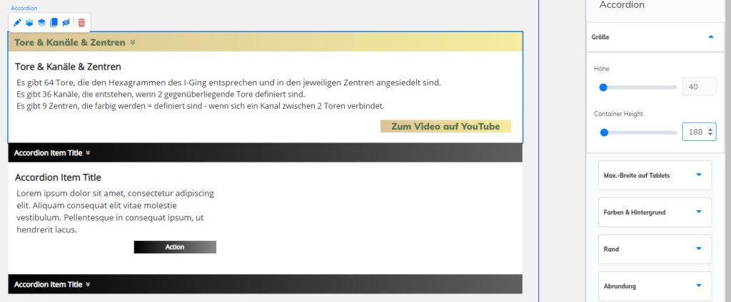Du siehst, das 1. Element ist gestaltet – das 2. ist im Original – außer der Breite, die hab ich für die ganze Gruppe geändert, indem ich die Box breiter gezogen habe. Aber du siehst, innerhalb eines einzelnen Elementes kannst du wirklich Alles ändern und anpassen – die endgültige Höhe mache ich rechts im Menü mit „Container Height“.