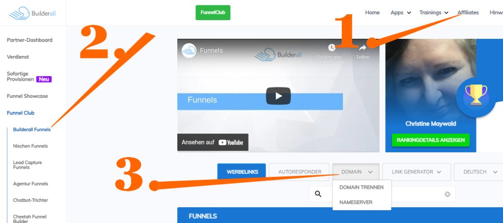 und danach im linken Bereich auf Werbefunnel und dort auf Builderall Funnels – dann bekommst du die neue MenüLeiste, in der du deine Domain aufschalten – oder auch trennen kannst