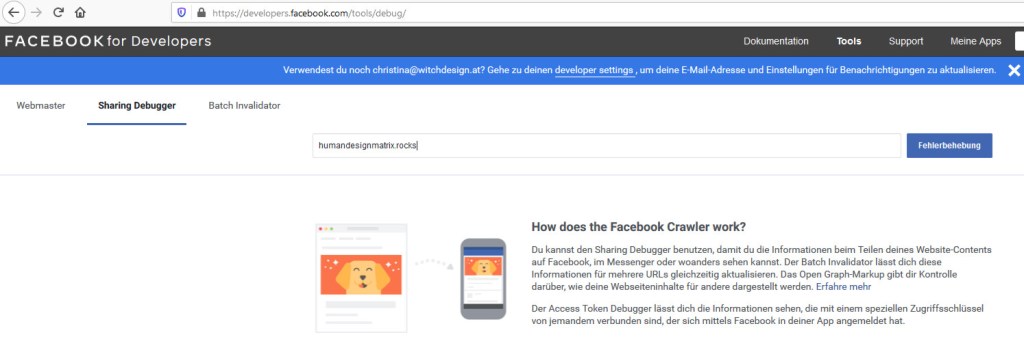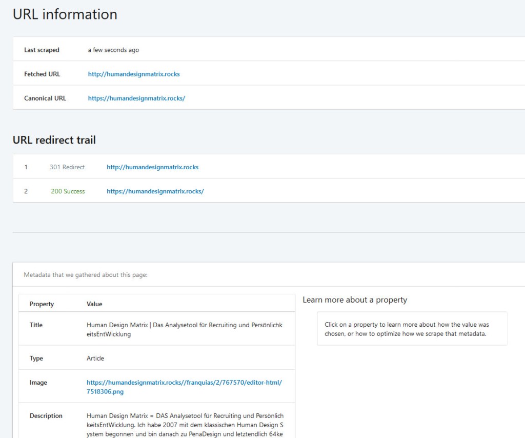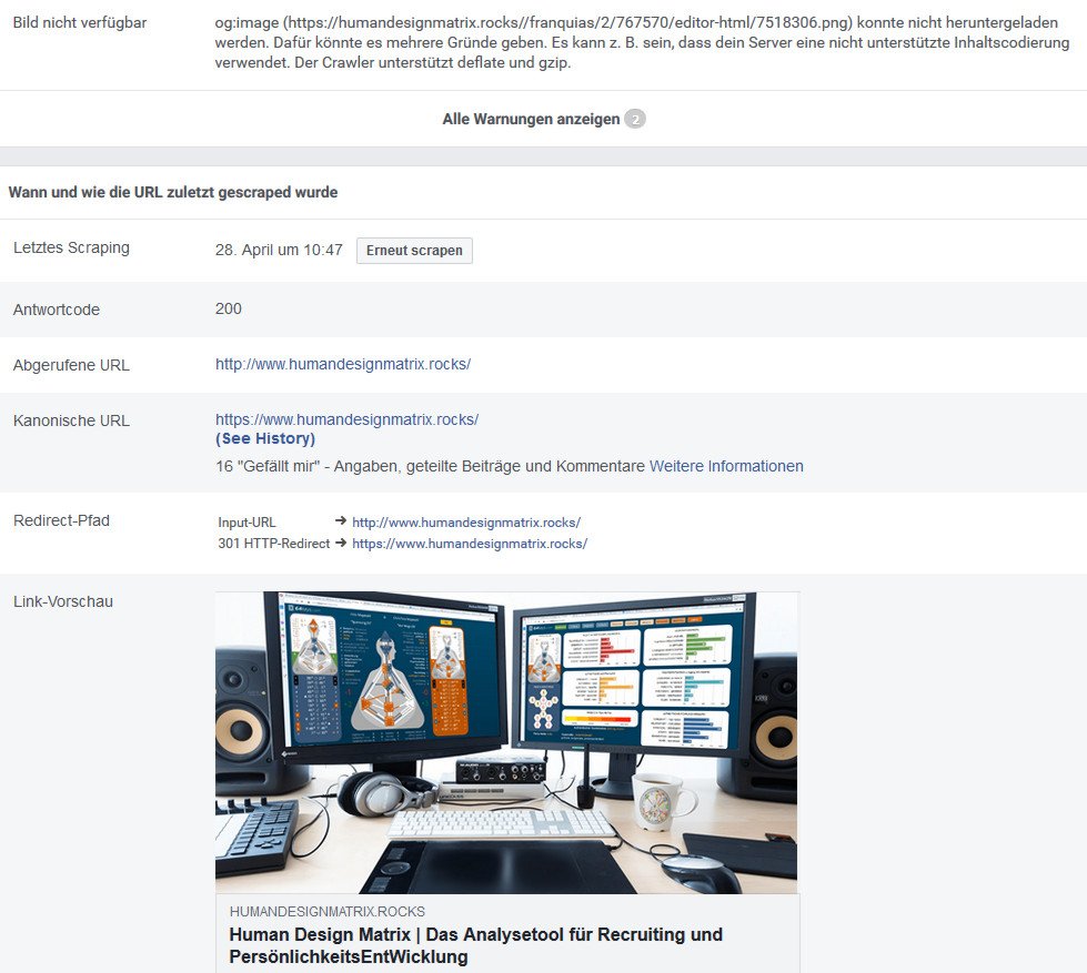 Danach bekommst du einen Überblick über deine Seite, wie sie aktuell von Facebook „gelesen“ wird – und du musst – eventuell mehrmals auf – erneut scrapen – klicken – bis das neue Bild – oder der aktualisierte Text – erscheint.