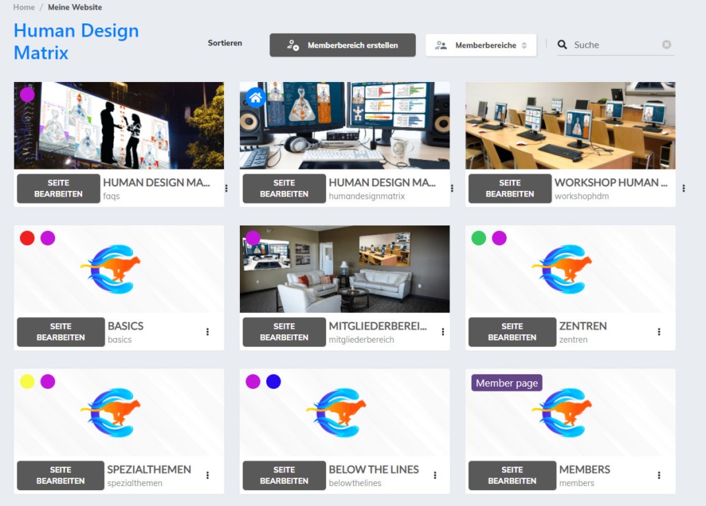 Solltest du mehrere Mitgliederbereiche angelegt haben, kannst du auch eine automatische ÜbersichtsStartSeite erstellen lassen – die findest du bei – neue Seite – nennt sich dann – members – die könnte dann so aussehen – in der Bearbeitungsansicht