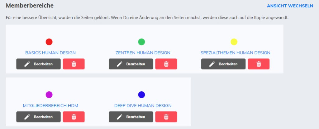 Nachdem du gespeichert hast, wird ein eigener Mitgliederbereich angelegt und gekennzeichnet, welche Seite(n) zu welchem Bereich gehören. Da ich ursprünglich 4 unterschiedliche MB’s hatte – und dann einen eigenen neuen gemacht hatte – hab ich mal nen Screenshot gemacht, bevor ich die alten wieder lösche – damit du es besser erkennen kannst. wie das aussieht:
