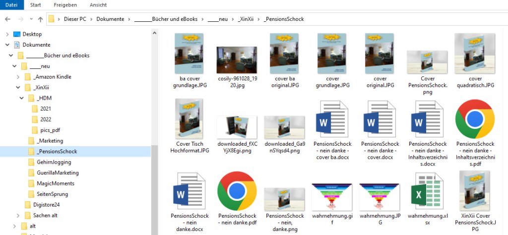und dort kommt dann alles rein, was zu diesem Buch passt – also von Fotos fürs Cover bis zu selbst erstellten Tabellen und Diagrammen. Darüber hinaus dann noch das endgültige BuchCover selbst – und auch das Inhaltsverzeichnis und so – als Beispiel mein letztes Freebie: