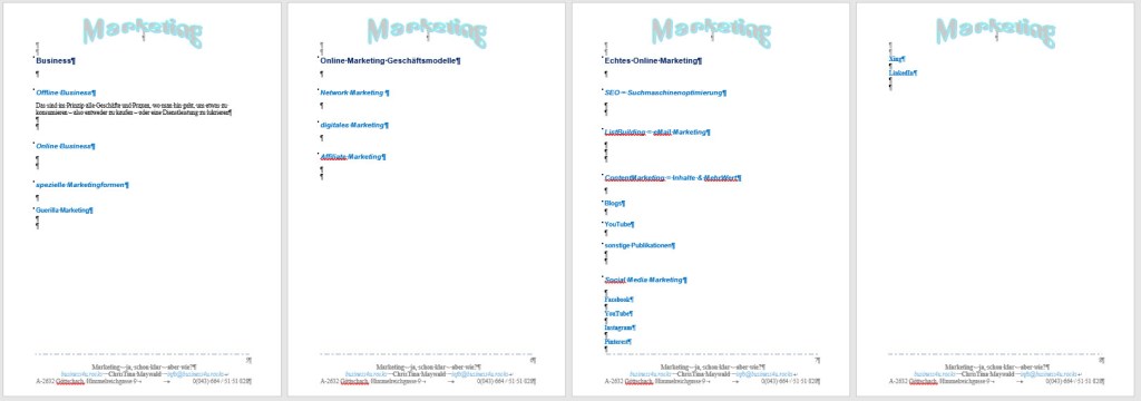 Die Idee dazu kam, als ich das eBook – PensionsSchock? Nein – danke! – schrieb – weil ich da das Kapitel über die ganzen Möglichkeiten des Marketings auf Überschriften beschränkt habe. einerseits, weil es eben viele, die vom PensionsSchock betroffen fühlen, nicht interessiert – andererseits, weil das so umfangreich ist, dass es nicht nur Bücher, sondern Studiengänge füllt.