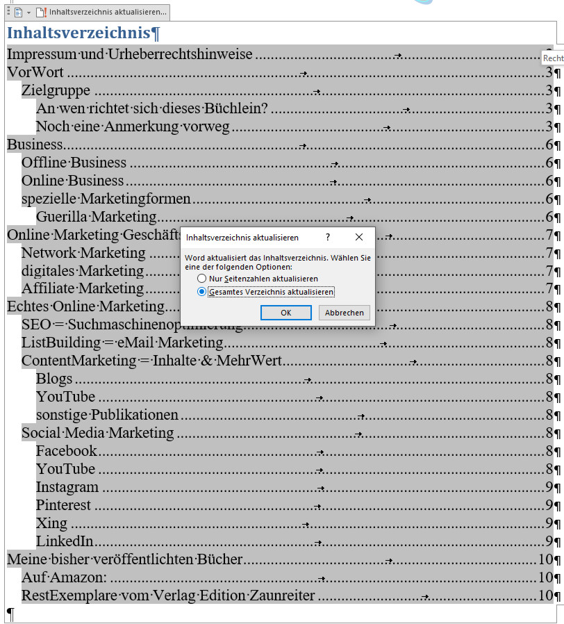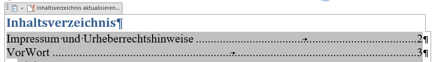 und dann auf – Inhaltverzeichnis aktualisieren – klicken – oder alles zu markieren (ALT + A) und dann die Taste F9 zu drücken, in beiden Fällen wirst du dann gefragt