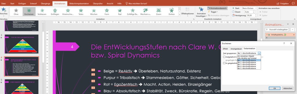 Ich zeige es dir anhand der Tabelle für das nächste Video – es geht um den Weg des Lernens und der EntWicklung – so soll das EndErgebnis aussehen – aber die einzelnen Punkte sollen einzeln einblenden – was jetzt auf den ersten Blick nicht möglich ist.