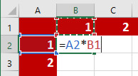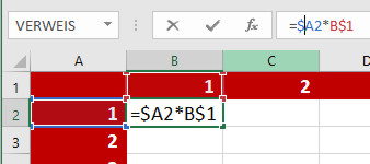A2 = wir wollen hier zwar immer mit dem Wert rechnen, der in der Spalte A ist – aber die Zeile soll sich anpasssen