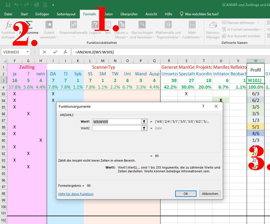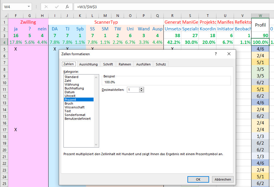 Dann kam ich auf die Idee, oben jeweils Summen zu machen – außer bei den Profilen – wobei da machte ich sie dann erst recht, damit ich später immer auch ganz genau weiß, wie viele Daten von Menschen ich schon erfasst habe – und auch als fixe BerechnungsZelle für die Prozente.