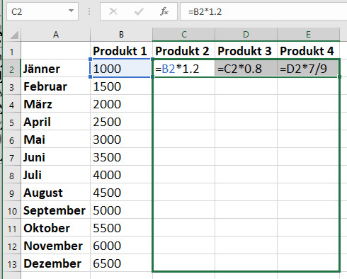Es soll hier jetzt mal nur um die Formeln gehen – wenn wir sie nach rechts ziehen, dann passen sich in der Formel jeweils die Spaltenbezeichnungen an: