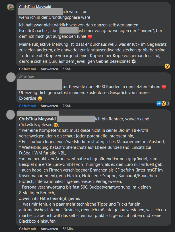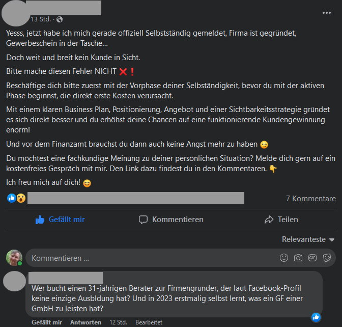 Also da war diese Art Werbeanzeige auf dem privaten Profil eines BusinessCoaches – auf die ein „Rentner in Vollzeit“ sich bemüßigt fühlte, zu kommentieren.