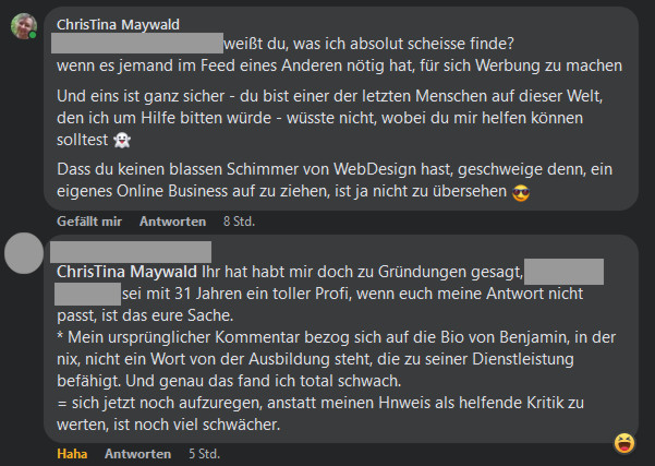 Ergänzung 7.8.2022 – in der Zwischenzeit hat er jetzt noch einen anderen Kommentar von mir – in einer der Gruppen, in der ich auch bin – zu ganz einem anderen Thema – mit einem weinenden Smiley bedacht – der Typ hat echt ein nachhaltiges Problem.