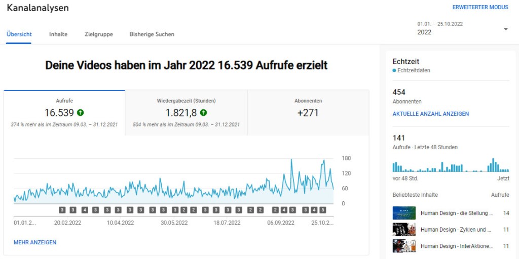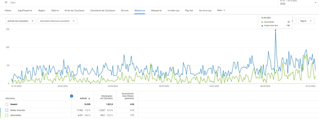 Im nachstehenden Diagramm siehst du auch gut die Verteilung zwischen Abonnenten und „neuen“ InteressentInnen – und auch diesen einen Ausschlag der Nicht-Abonnenten vom 16.9.2022 – das waren die Videos zum SakralZentrum.