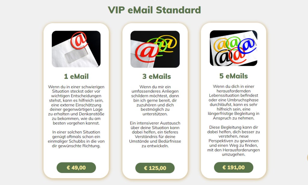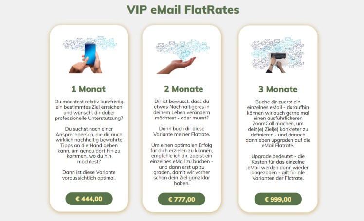 Daher gibt es jetzt eben 1 oder 2 oder 3 Monate als Bundle – und ich empfehle aber auch, dass man sich vorab mal nur 1 eMail bucht – um dann eben auch zu schauen, welche Ziele gemeinsam in der danach zu buchenden Zeit erreicht werden sollen.
