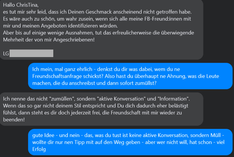 Ich mein, mal ganz ehrlich – denkst du dir was dabei, wem du ne Freundschaftsanfrage schickst? Also hast du überhaupt ne Ahnung, was die Leute machen, die du anschreibst und dann sofort zumüllst?