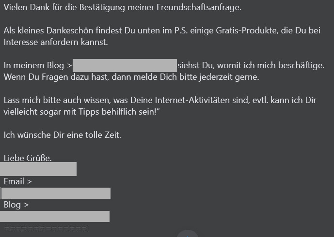 Ich bekomme ne Freundschaftsanfrage – und dabei steht irgendwas wie – „Ich hab gesehen, du hast bei XYZ kommentiert – interessierst du dich auch für Affiliate Marketing?“ Dann hätte ich die Chance gehabt, fest zu stellen – „Nein, ich mag nur das, was XYZ schreibt“ – und gut wärs gewesen.