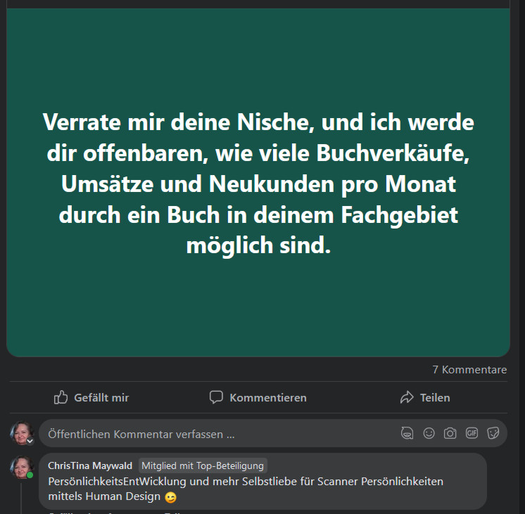 Wenn jetzt also wirklich jemand Seriöses an mir und meiner Dienstleistung interessiert wäre – bzw. mich individuell zu unterstützen – hätte er einfach auch auf meinem Profil meine Seite aufrufen und meine Angebote anschauen können – und hätte dort gefunden: