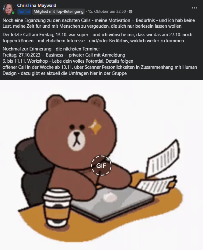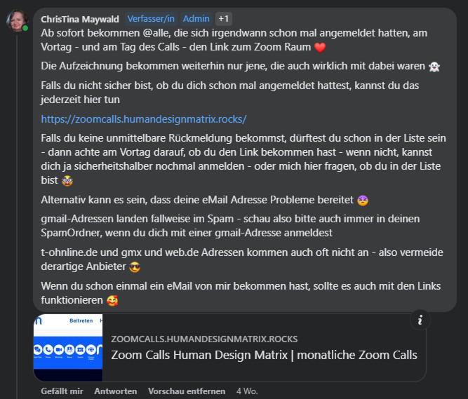 PS: und ich mache auch keine „private“ Zoom Calls – um dann den Link öffentlich zu teilen – und ja – eine Veranstaltung in (m)einer Facebook Gruppe ist für jede/n ersichtlich, die/der in der Gruppe ist – also nicht nur für die, die wirklich angemeldet sind – daher teile ich den Link dort sicher nicht – und sonst hätte ich auch nicht ausdrücklich geschrieben – schick mir eine private Nachricht im Messenger.