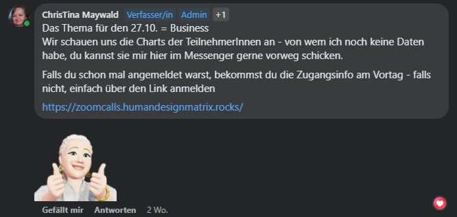Vorigen Freitag hatten wir mal wieder einen Zoom Call in Bezug auf Human Design – diesmal mit dem Thema = Business. Wie immer am letzten Freitag im Monat war das der Call, an dem man sich vorher anmelden musste – und dessen Aufzeichnung nur die bekommen, die mit dabei waren.