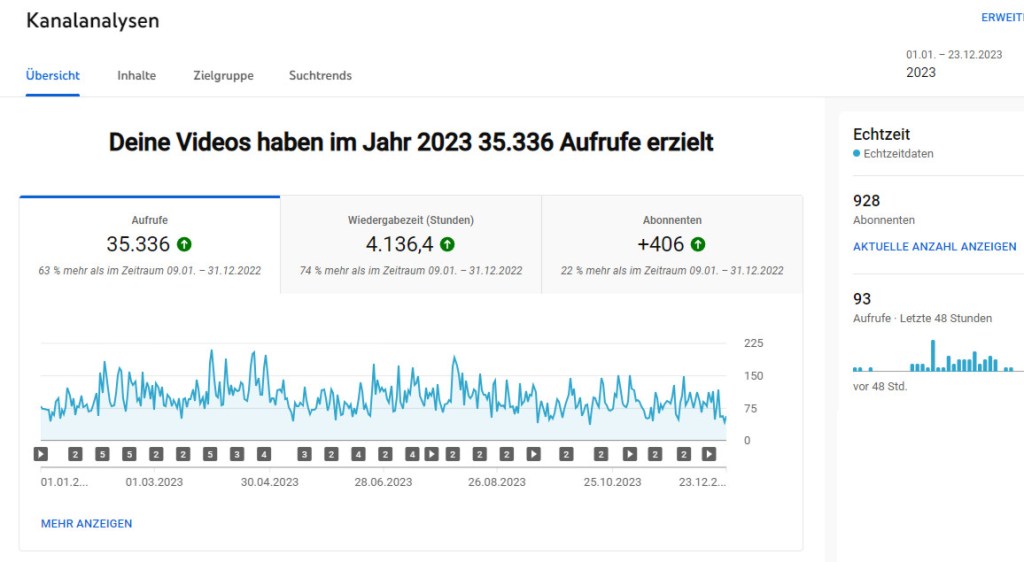Das war mein Ziel für 2023 – ich werde es nicht ganz erreichen, aber immerhin halte ich aktuell bei 928 AbonenntInnen – und zwar alles organisch – nur durch die Inhalte, zu denen mein Kanal gefunden wird – und im Zusammenspiel mit allen anderen meiner Online Präsenzen – ich habe keine bezahlte Werbung geschalten: