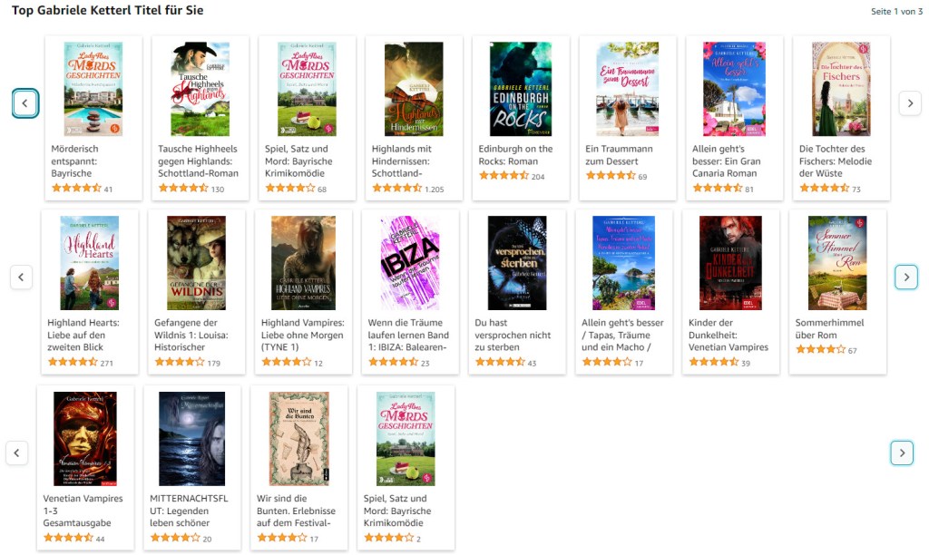 Danach kamen viele andere Bücher aus Gabrieles Feder – in unterschiedlichsten Genres – nachstehend ein Screenshot ihrer Bücher bei Amazon: