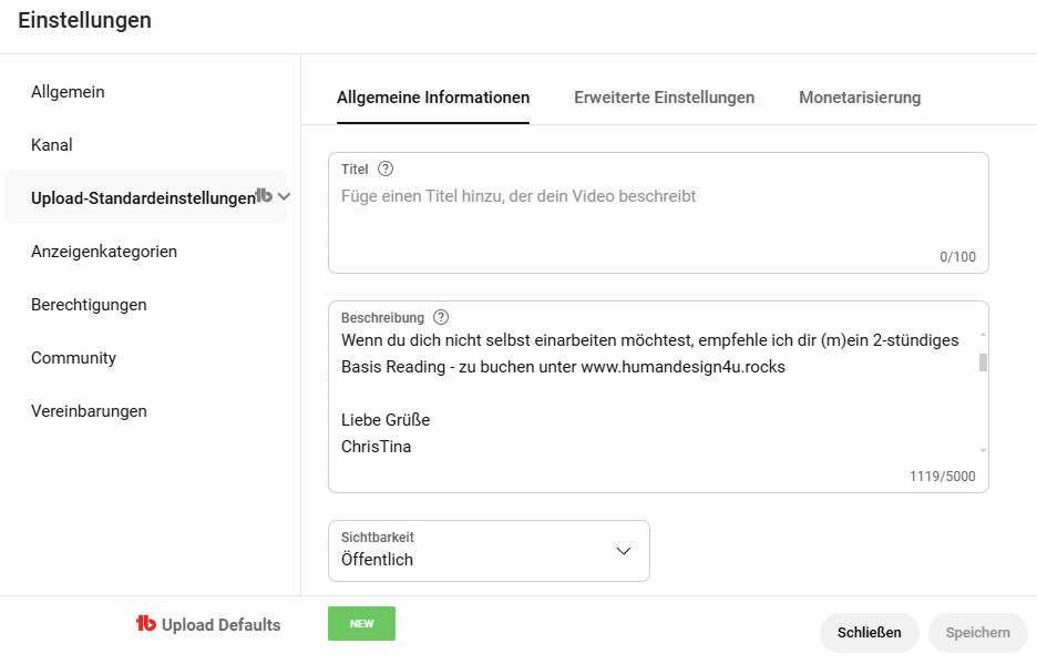 Ich habe auch nach dem Hochladen der ersten 4 Videos diese Upload StandardEinstellung nochmals angepasst – damit ich wirklich den kleinstmöglichen Aufwand habe, was ich dann händisch dazu schreiben muss.