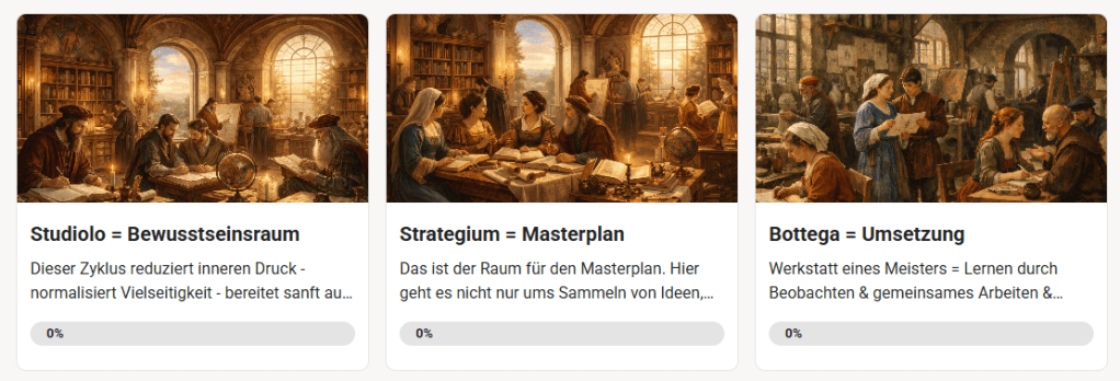 Ich hatte da eine Idee – in Bezug auf den ursprünglichen Namen einer meiner Skool Communities = Renaissance Atelier ==> mittlerweile – Scanner & ihr Business – und plante eine langsame Trilogie, um von Ideen zu konkreten Masterplänen – und letztendlich in die Umsetzung – zu kommen – businesstechnisch.