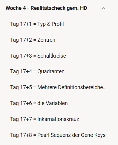 Du siehst, wir haben dann noch die gesamte Human Design Session nach dem Tag 17 rein gehangen – entstand aus der Challenge an sich – weils einfach stockte – und daher haben wir umgeschwenkt – und später dann weiter gemacht.